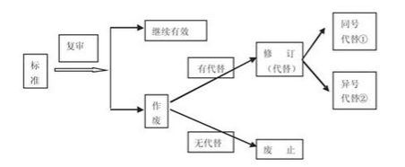 有效与作废是一对对立关系,经过复审,标准只存在“继续有效”或者“作废”两种结果,而作废又导致“修订”与“废止”两种结果。通过下图,我们可以直观的看出标准继续有效与作废、代替与废止的关系。